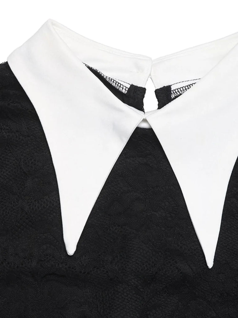 Elevate your evening wardrobe with this sophisticated midi dress, where vintage allure meets contemporary elegance. Crafted from luxurious black lace, the design features a striking white contrast collar that frames the neckline with refined detail. The bodycon silhouette hugs your curves gracefully while the midi length offers timeless sophistication. Long sleeves add an air of mystery and polish, making this piece perfect for upscale events, date nights, or whenever you want to command attention with understated glamour. A versatile investment piece that transcends seasons.